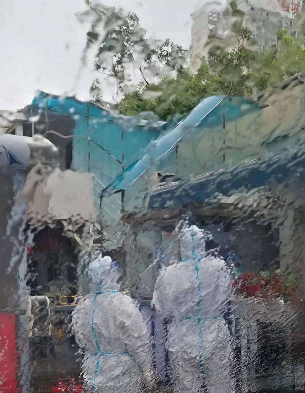 ▲市中医院120负压转运组阮俊医生和刘东护士冒雨在宝安区中心医院与发热门诊人员交接(120负压转运车司机叶正勇 摄)