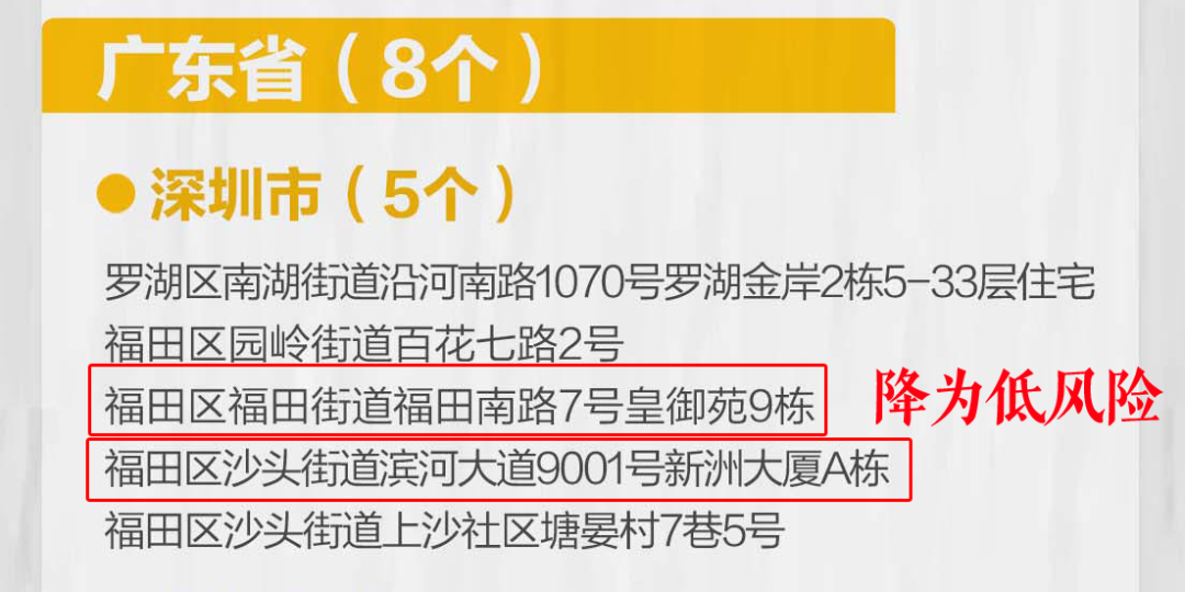 根据疫情防控工作需要,自2022年3月25日21时起,将福田街道皇御苑9栋由中风险地区调整为低风险地区;将福田街道皇御苑小区4栋、5栋、9栋由封控区、管控区调整为防范区。