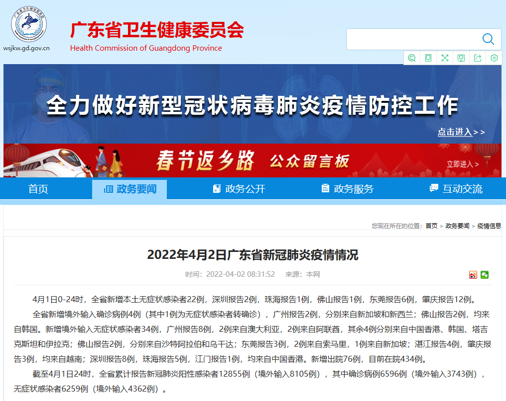 4月1日0-24时,全省新增本土无症状感染者22例,深圳报告2例,珠海报告1例,佛山报告1例,东莞报告6例,肇庆报告12例。
