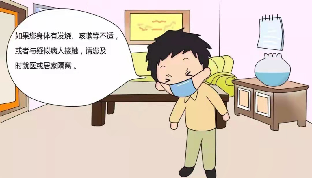 3、时刻关注自己的身体状况,如有发热、咳嗽、咽痛等可疑症状出现,应尽快就医,查明原因,推迟出行。