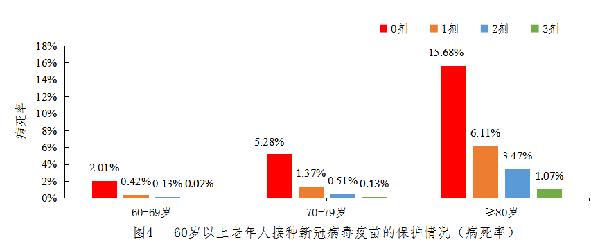 来看国内某地60岁以上老年人接种新冠病毒疫苗的保护情况,接种3剂次和接种2剂次疫苗的病死率明显低于接种0剂次和1剂次,比如60-69岁年龄组接种3剂次的病死率比0剂次降低了99%,80岁以上年龄组接种3剂次的病死率比0剂次降低了93%(图4)。