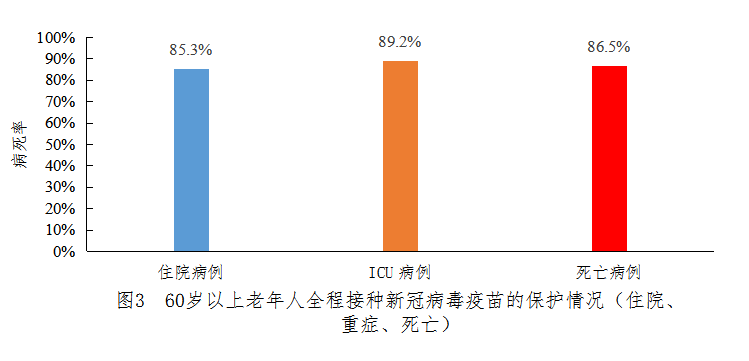 真实世界研究结果显示,60岁以上老年人全程接种新冠病毒疫苗后对新冠肺炎引起的住院保护率为83.3%,对ICU的保护率为89.2%,对死亡的保护率为86.5%(图3)。证实了新冠病毒疫苗在真实世界大规模使用(国家层面)的保护效果,尤其是确认了疫苗对住院/重症/死亡的良好保护效果[2]。