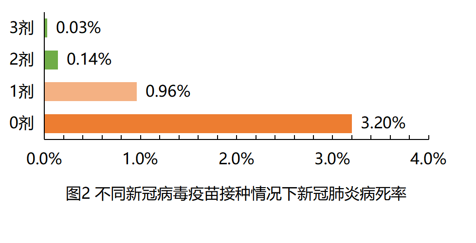 根据国务院联防联控机制权威发布等相关数据显示,因新冠肺炎死亡病例中超过七成没有疫苗接种史(图1),未接种疫苗人群的病死率是接种两剂次疫苗的22.85倍、是接种三剂次疫苗的106.67倍(图2)[1]。因此,全程/加强接种新冠病毒疫苗可以大幅降低感染者的病死率。