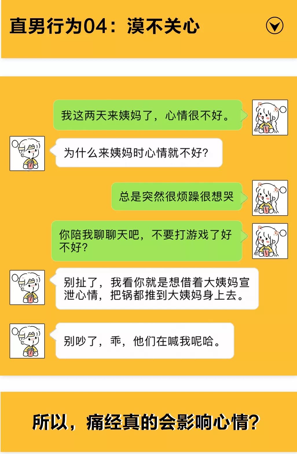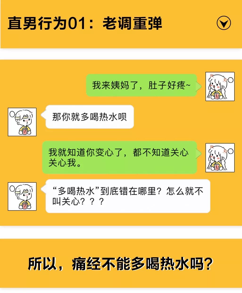 殊不知,姨妈期更令人头疼的是男友的“直男行为”。他们只知道把“多喝热水”、“歇歇就好”挂嘴边,表达关心的言辞一句比一句敷衍。