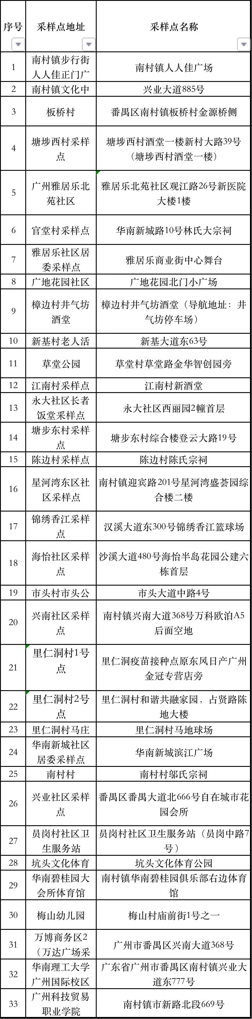 三、检测地点:共33个