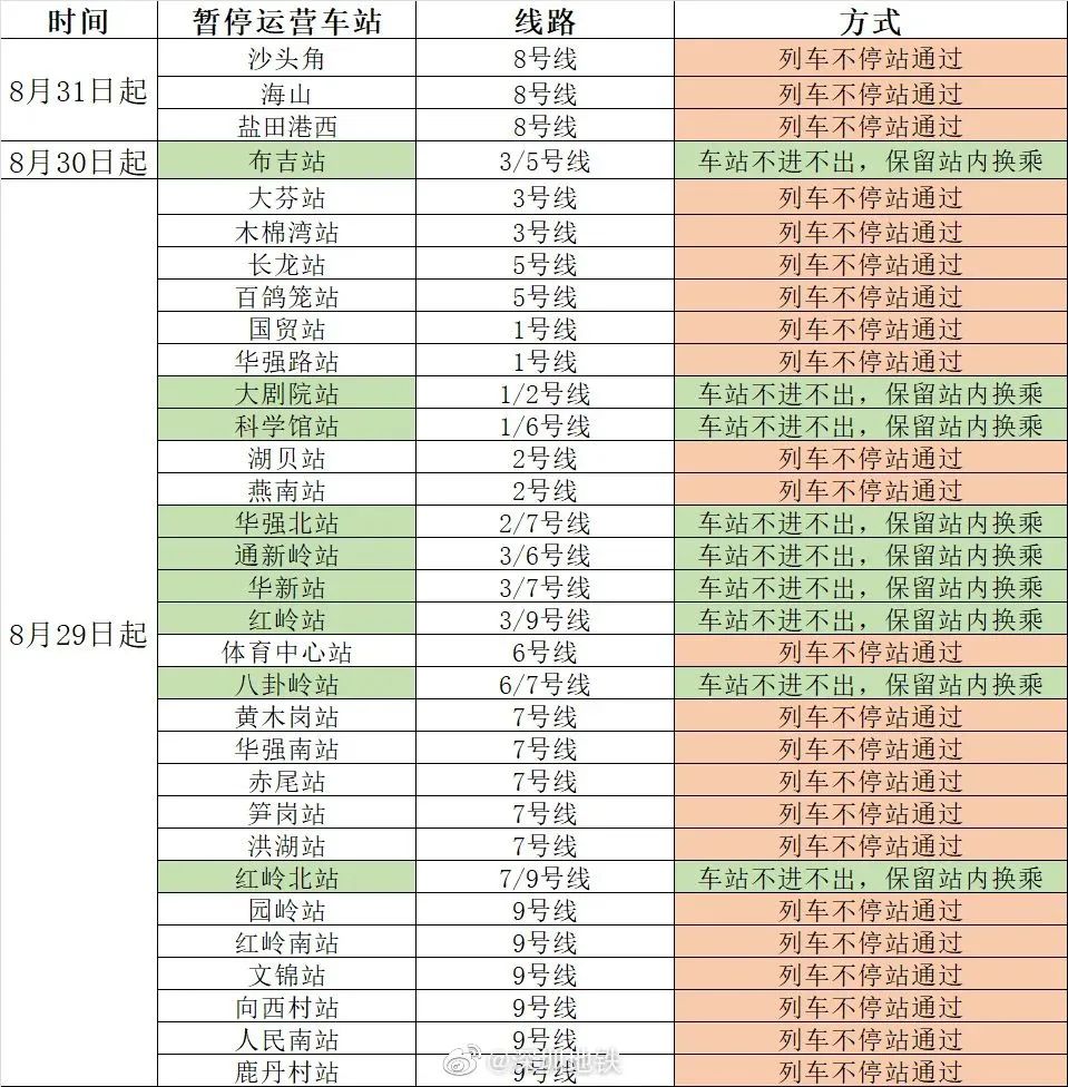 深圳地铁发布运营公告:自2022年8月31日10:00起,深圳地铁8号线沙头角站、海山站、盐田港西站暂停运营服务,具体恢复时间待另行通知。