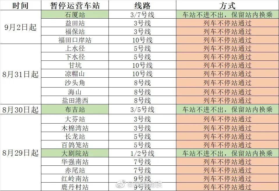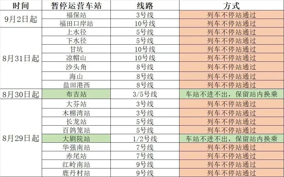 此外,部分车站恢复运营。9月2日起,1号线国贸站、1号线华强路站、1/6号线科学馆站、2号线湖贝站、2号线燕南站、2/7号线华强北站、3/6号线通新岭站、3/7号线华新站、3/9号线红岭站、6号线体育中心站、6/7号线八卦岭站、7号线黄木岗站、7号线笋岗站、7号线洪湖站、7/9号线红岭北站、9号线园岭站、9号线文锦站、9号线向西村站、9号线人民南站恢复正常运营。其它停运车站保持停运不变(详见图表)。