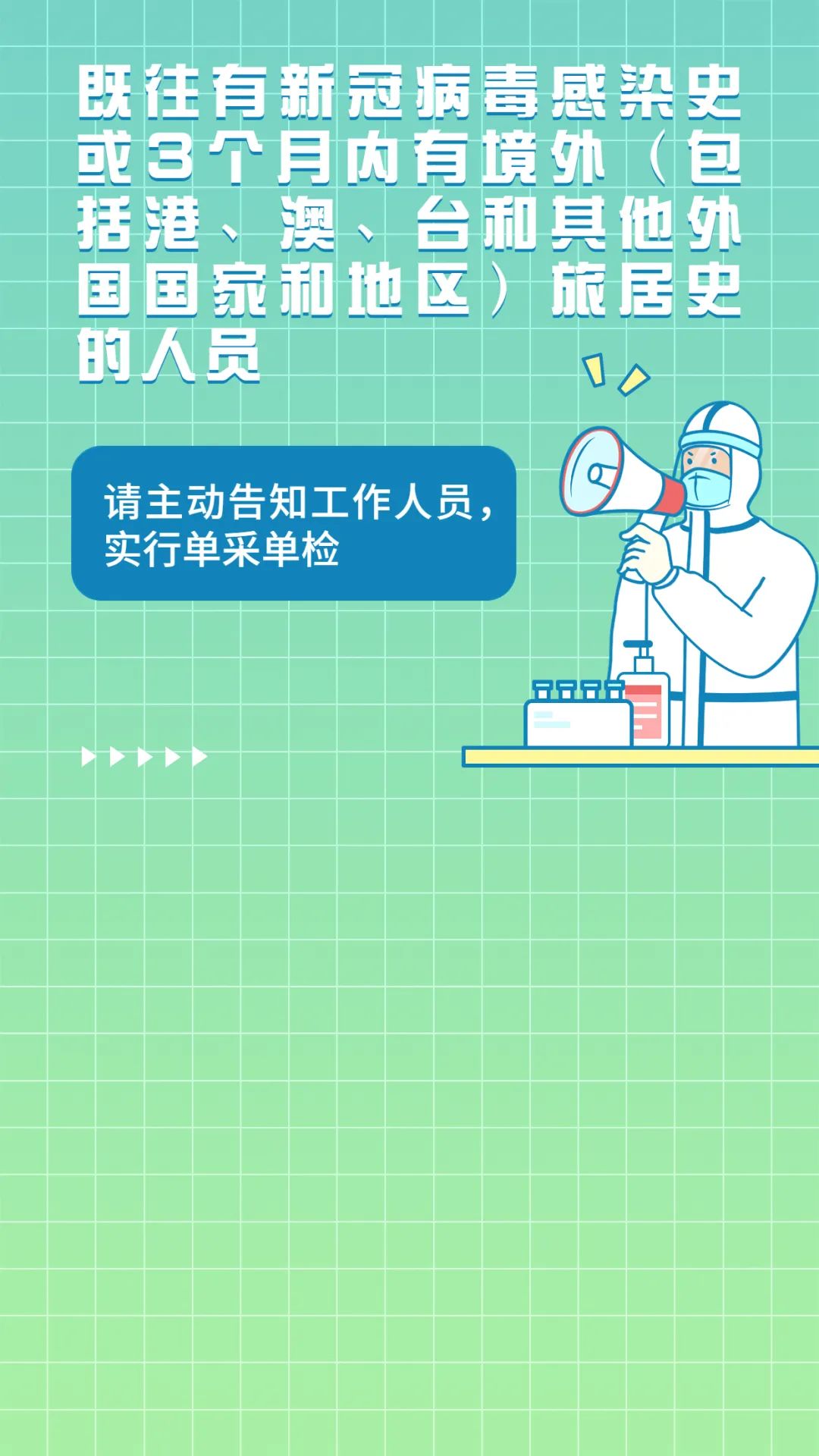 既往有新冠病毒感染史或3个月内有境外(包括港、澳、台和其他外国国家和地区)旅居史的人员,请主动告知工作人员,实行单采单检。