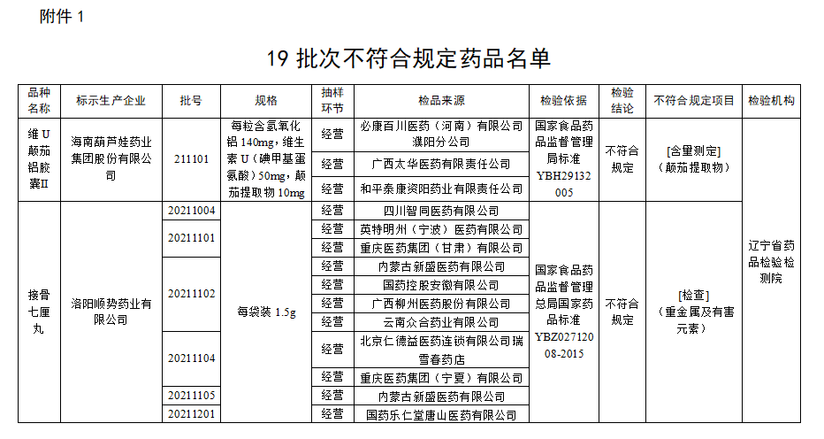 一、经辽宁省药品检验检测院检验,标示为海南葫芦娃药业集团股份有限公司生产的1批次维U颠茄铝胶囊Ⅱ不符合规定,不符合规定项目为含量测定。