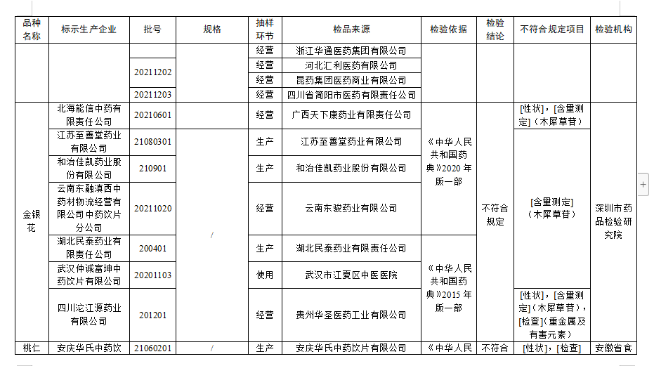 经深圳市药品检验研究院检验,标示为江苏至善堂药业有限公司、和治佳凯药业股份有限公司、湖北民泰药业有限责任公司、武汉仲诚富坤中药饮片有限公司、北海能信中药有限责任公司、四川沱江源药业有限公司、云南东融滇西中药材物流经营有限公司中药饮片分公司生产的7批次金银花不符合规定,不符合规定项目包括含量测定、性状、重金属及有害元素。