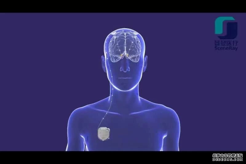 设备植入体内后的模拟图:两条电极穿过大脑前侧的神经核团,连接到神经调控装置(脑起搏器),固定在胸部右侧。与外部设备关联,就能远程调控参数