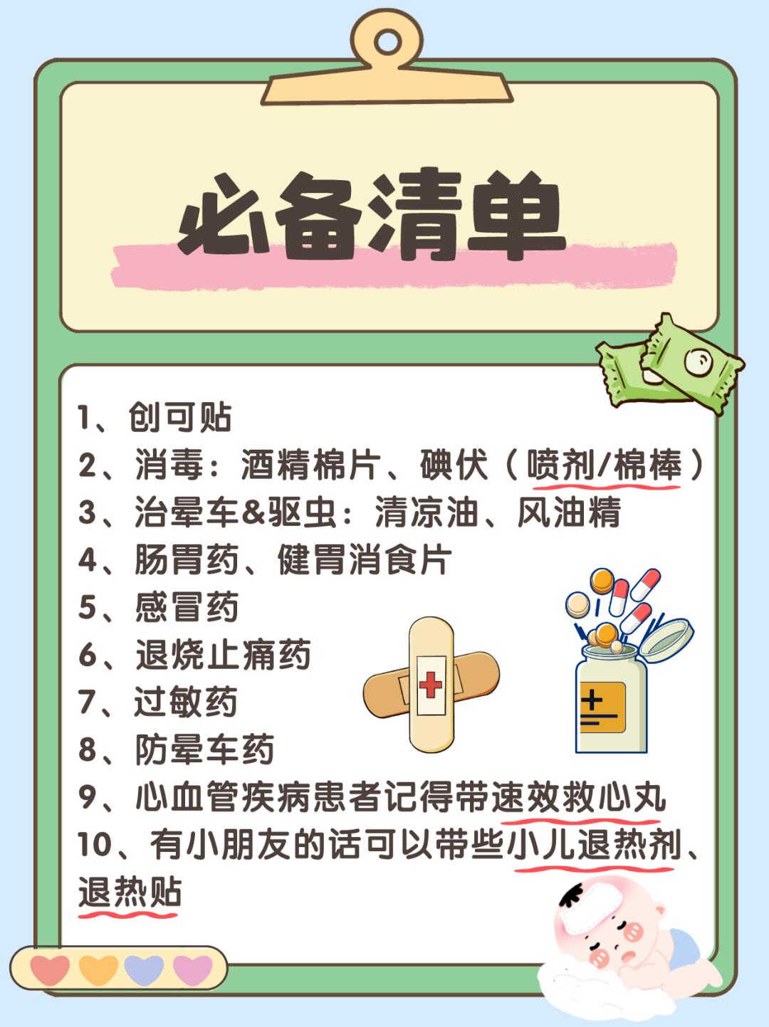 为了方便大家一次性把装备整理好,这里除了前面提到的对应药物,还补充了一些日常都可能用到的药品,一起总结给大家~