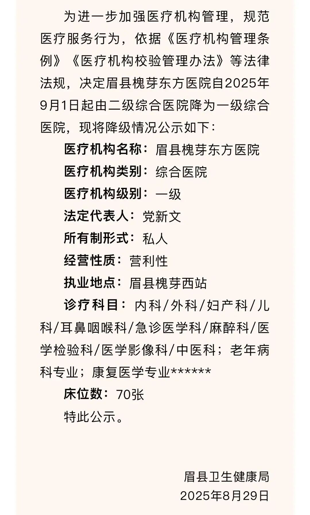 2025年9月1日清晨,陕西宝鸡眉县的街道还未完全苏醒,眉县槐芽东方医院的门前已围了一圈人。白底红字的“二级综合医院”招牌被缓缓取下,工人踮脚安装最后一颗螺丝后,新制作的“一级综合医院”招牌将取而代之。