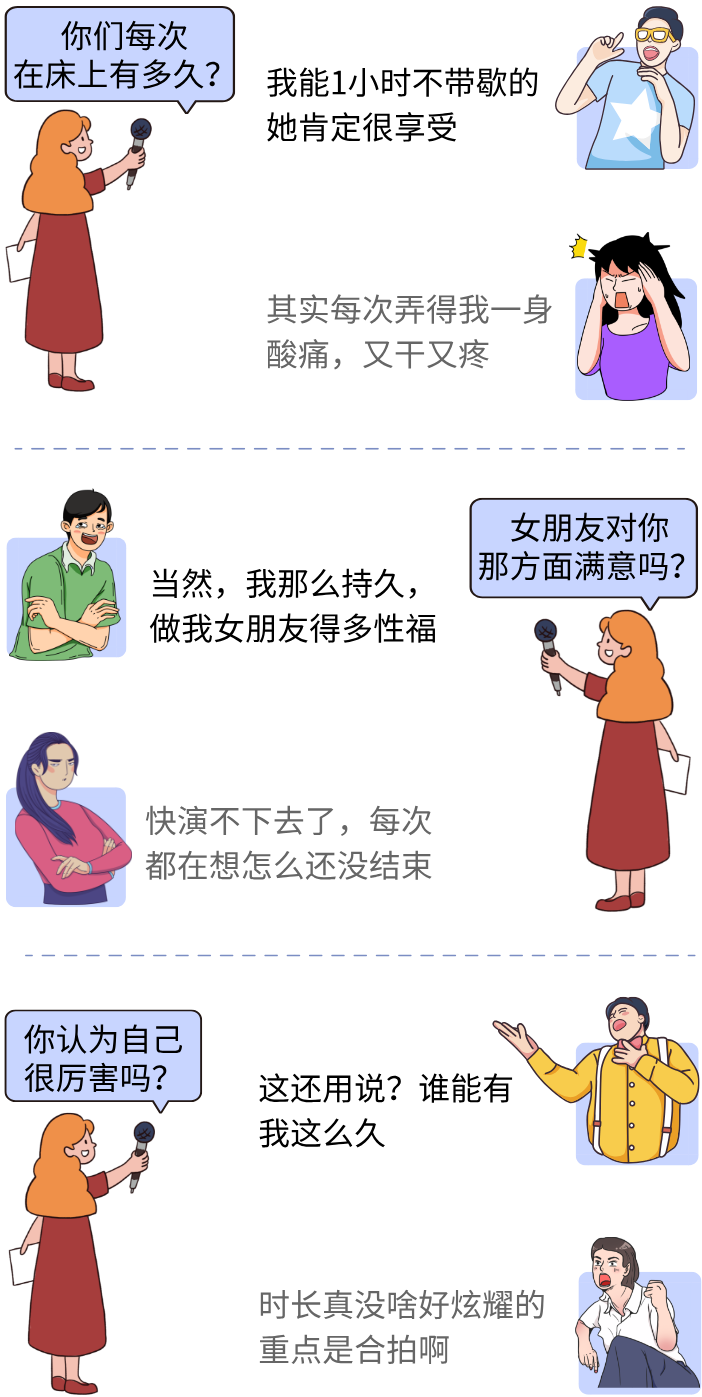 这样攀比时长的对话,在男性群体中并不少见。有的男生甚至觉得自己越持久,性能力越强,女朋友就越舒服。