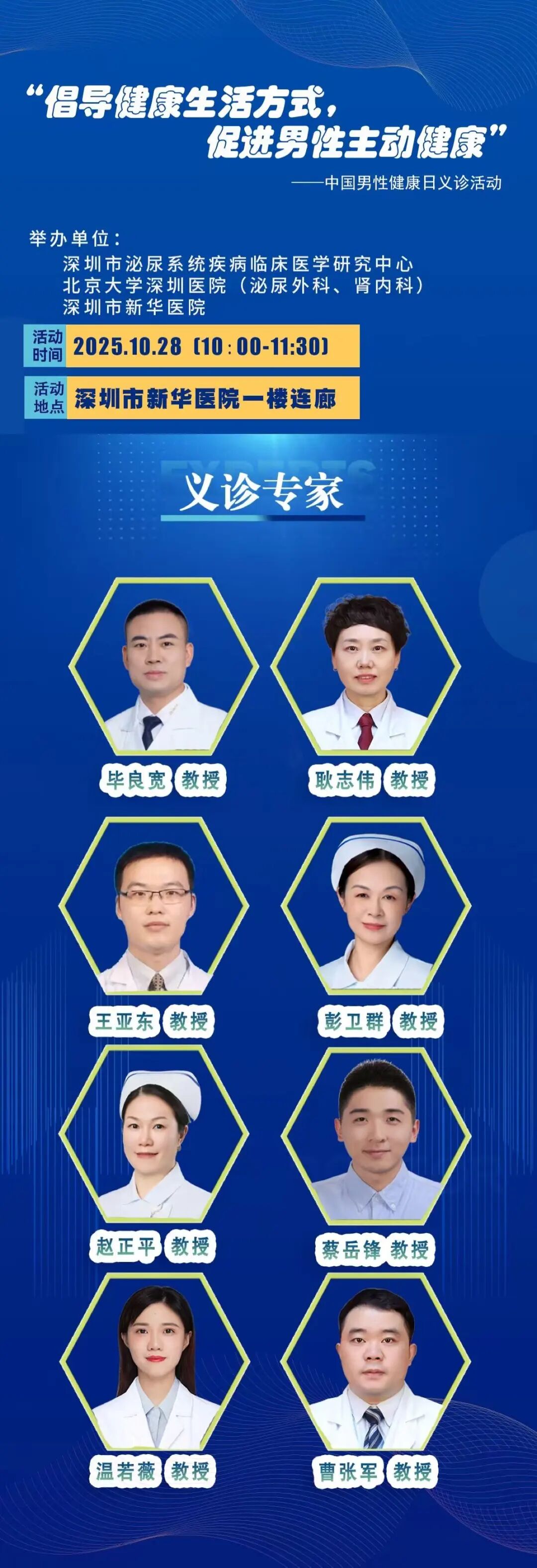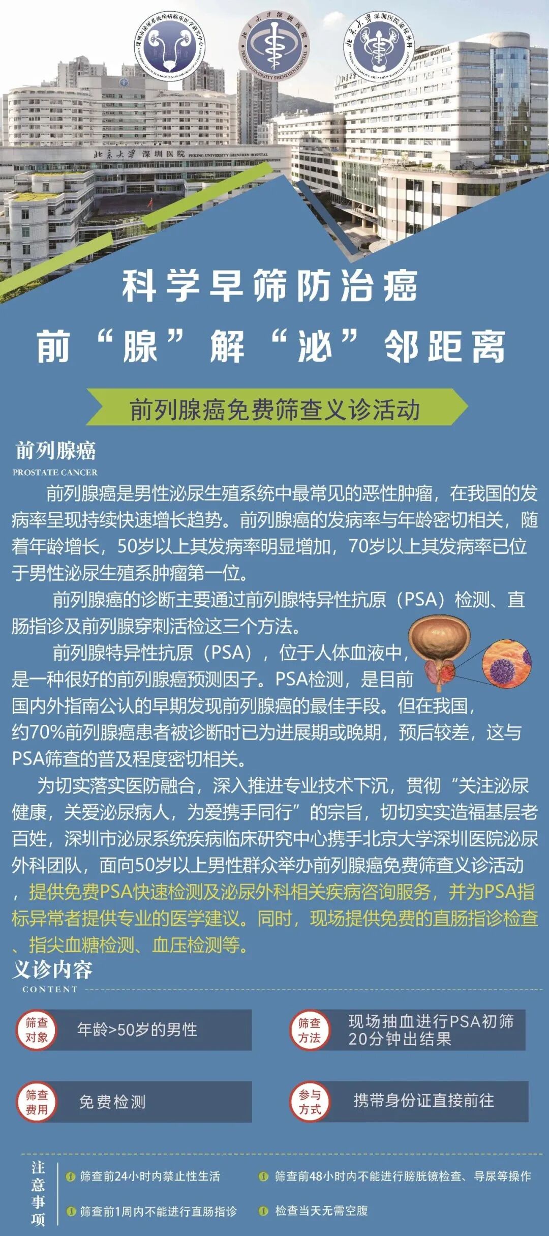 深圳市泌尿系统疾病临床研究中心携手北京大学深圳医院泌尿外科团队(都是专治泌尿问题的老专家,比你爸的棋友还靠谱!),面向50岁以上男性群众举办前列腺癌免费筛查义诊活动,专治老父亲的倔强!