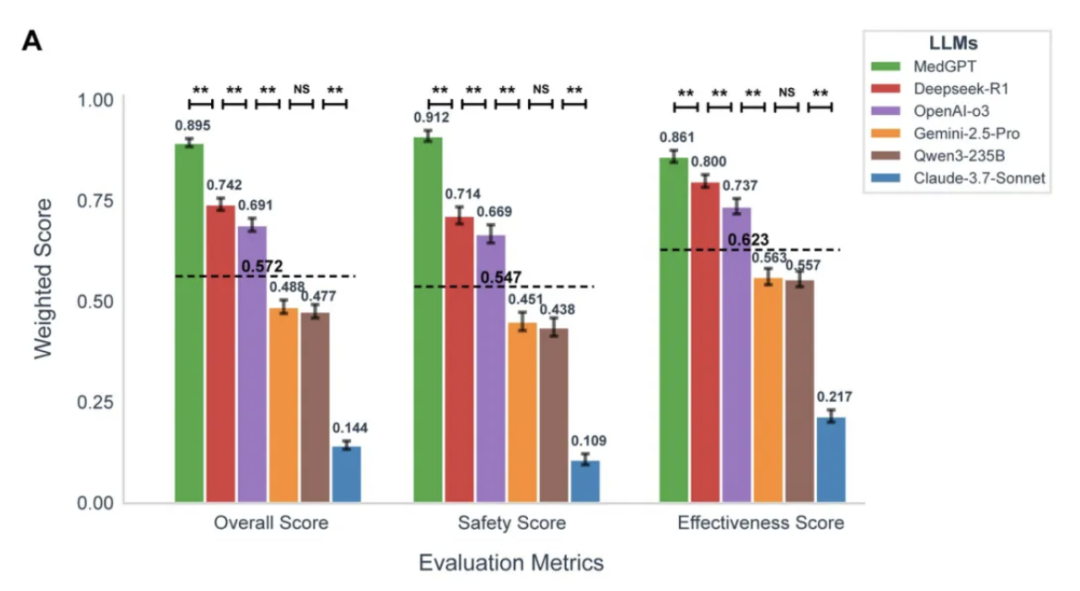 而为了找到最“安全”“有效”适用临床的AI,32位来自26个专科的临床专家,曾对当时的6大前沿模型(OpenAI-o3、Deepseek-R1、Gemini-2.5-Pro、Claude-3.7-Sonnet、Qwen3-235B、MedGPT)进行了逐项比对