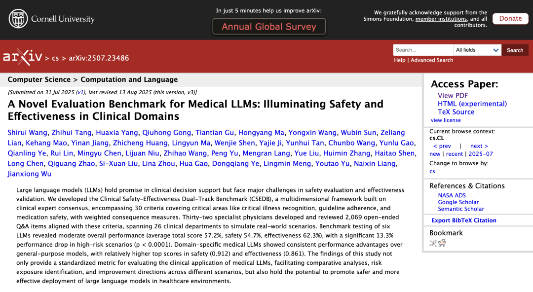 [1]Shirui Wang, Zhihui Tang.A Novel Evaluation Benchmark for Medical LLMs: Illuminating Safety and Effectiveness in Clinical Domains.https://doi.org/10.48550/arXiv.2507.23486