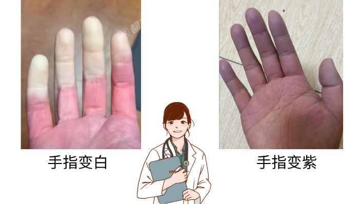 在寒冷环境或情绪紧张时,会出现血管功能障碍的情况,导致流向手指或足趾末梢的血流间歇性减少。因此手指或足趾末端皮肤会间歇性出现变白、变紫、变红,然后逐渐恢复正常,常伴有疼痛和感觉异常。这种现象也叫雷诺现象。