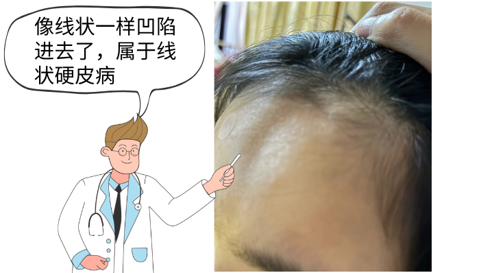 这个过程可能呈现为斑片状(硬斑病)或线状(线状硬皮病)分布。硬斑病看起来像皮肤上出现了圆形或不规则形状的硬化区域,而线状硬皮病则表现为肢体或头面部出现的线状硬化带。