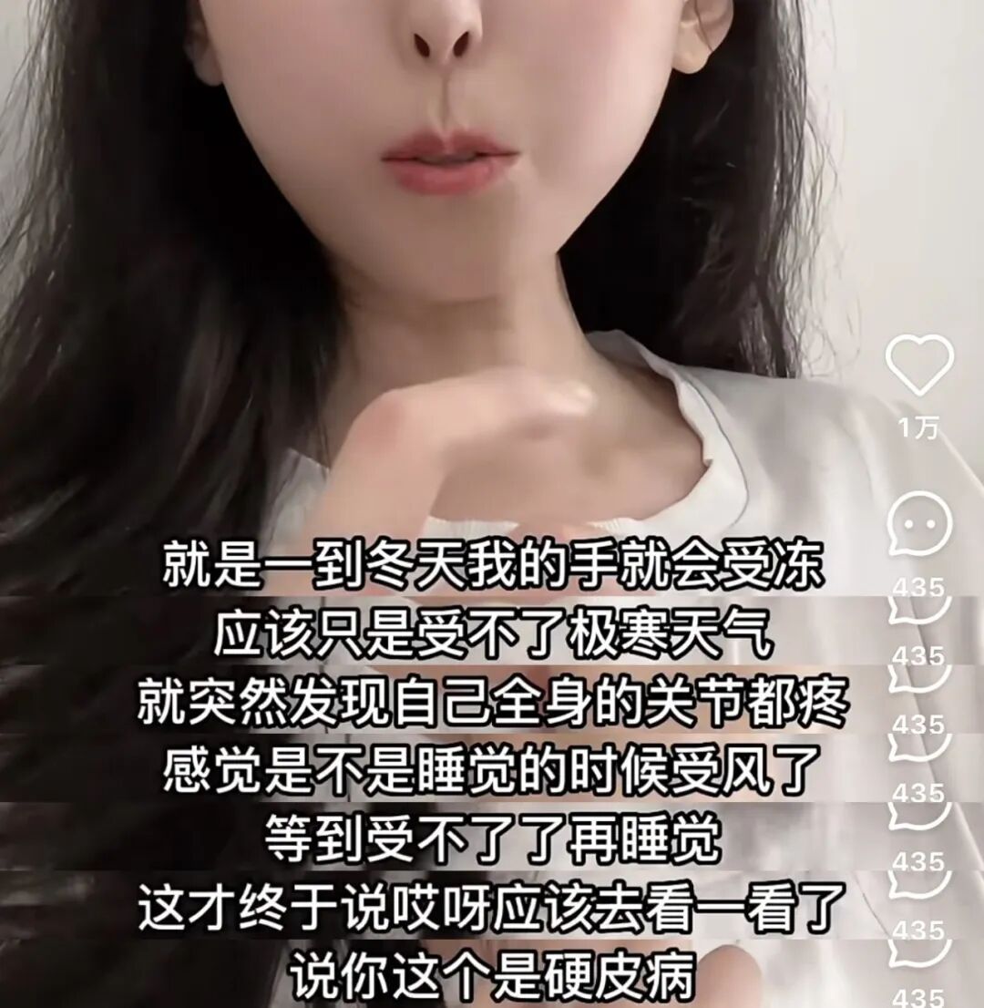第一次知道硬皮病,源于某音上一个叫“薛挺贵”的博主,她分享了自己得了这个罕见病的经历: