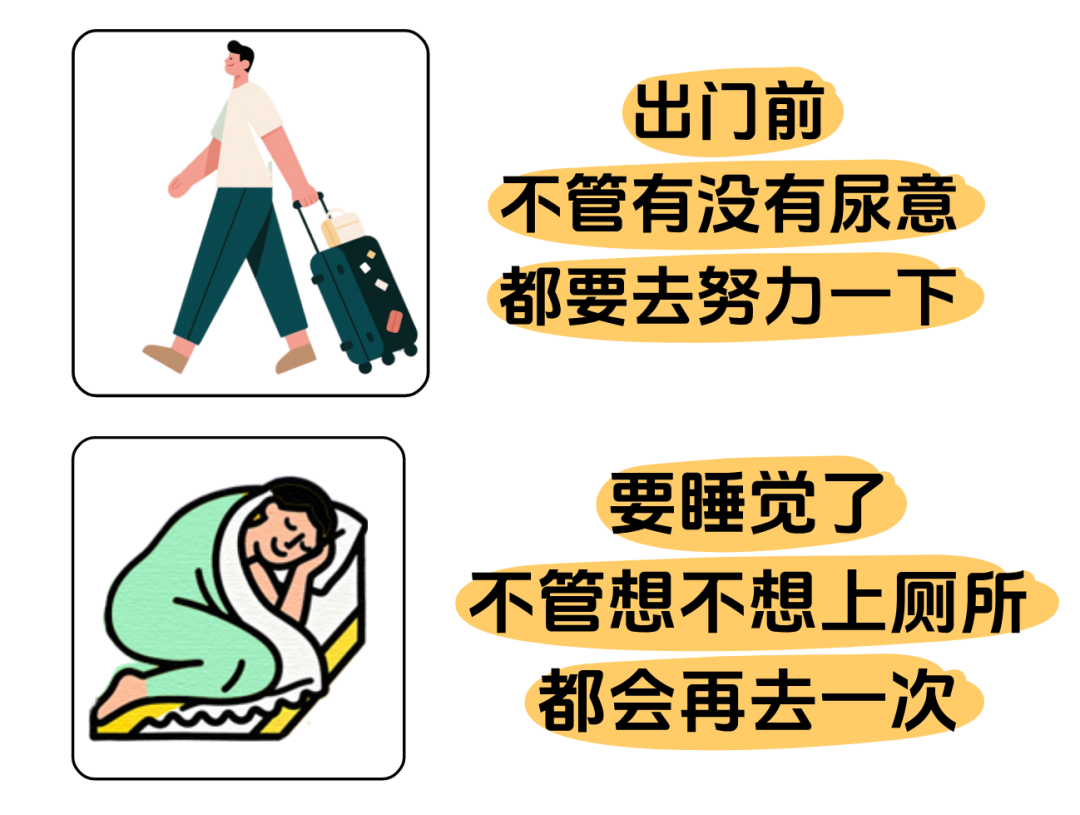比如,很多人习惯在出门前、睡觉前,不管有没有尿意,都去厕所“努力”一下,这被称为“预防性排尿”。
