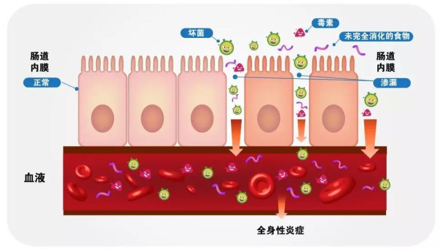 当细胞内壁受到损害时,失去了控制特定物质进出的能力,细胞间的连接越来越松动,未消化的食物微粒进入血液。身体的免疫系统认为未消化的食物微粒来病原体,不断对它们发起击,引起炎症,被称为肠漏综合征。
