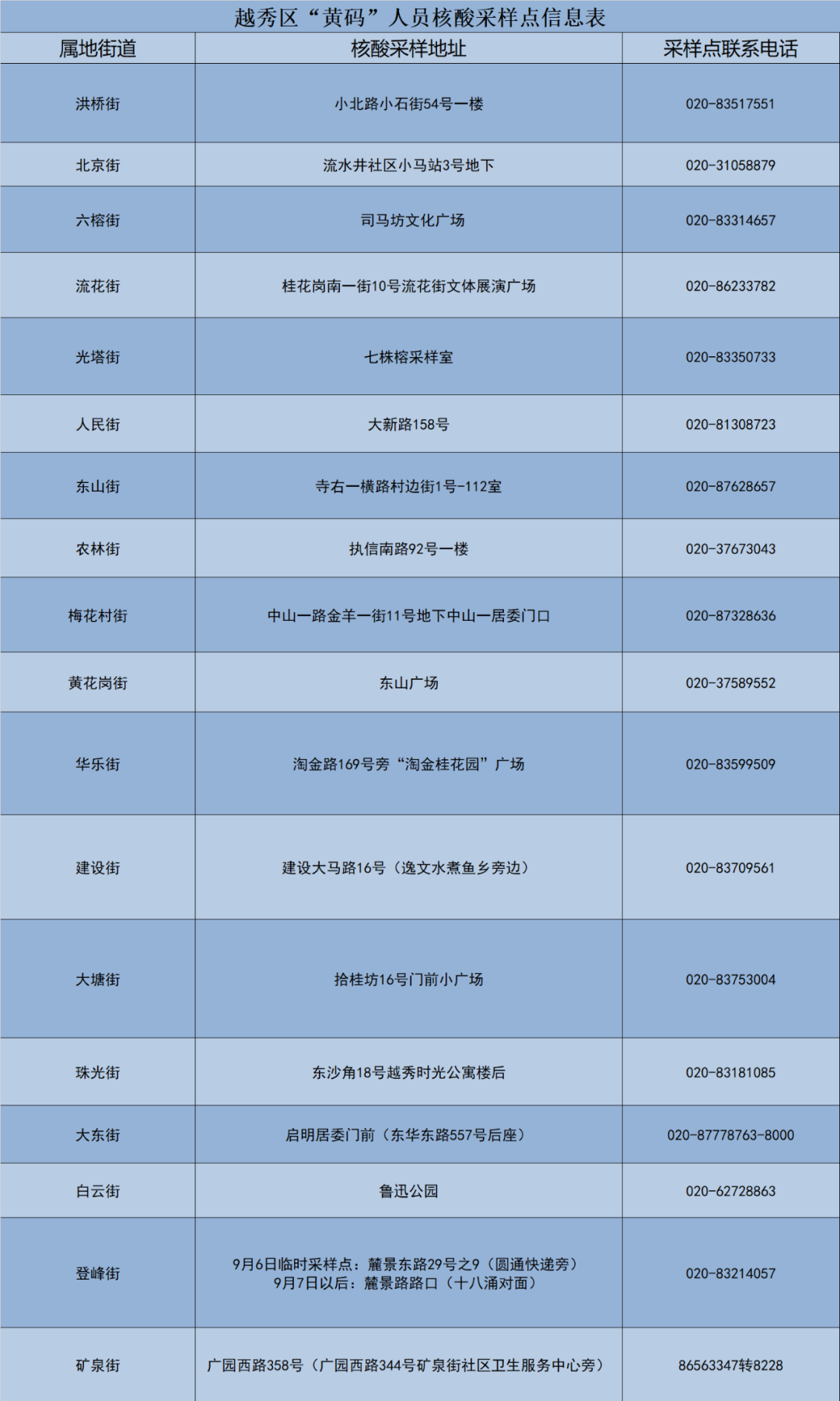 目前,越秀、荔湾、海珠、白云4区公布最新核酸采样点,为“黄码人员”提供便利的核酸检测需求。