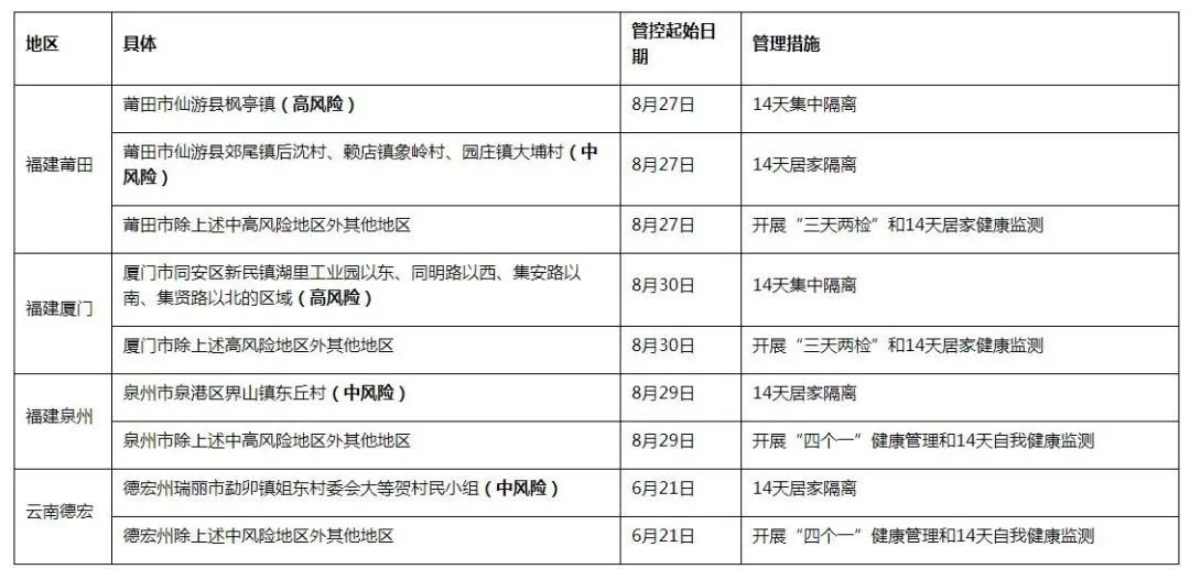 其中,对8月30日起从厦门市同安区新民镇湖里工业园以东、同明路以西、集安路以南、集贤路以北的区域(高风险)来(返)粤人员开展14天集中隔离;厦门市除上述高风险地区外其他地区开展“三天两检”和14天居家健康监测。