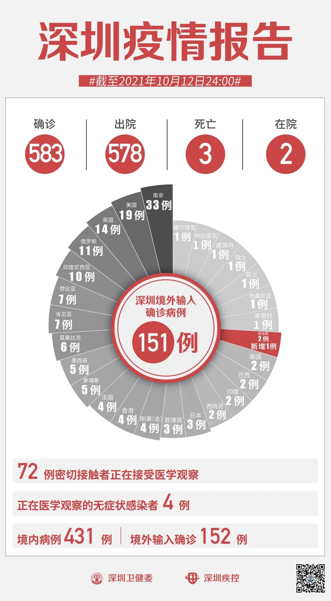 10月12日0-24时, 深圳新增1例境外输入确诊病例 。 该例境外输入确诊病例为 中国籍 , 女性 ,为新加坡输入,10月10日 从新加坡抵深 ,抵深后即被集中隔离,后转至深圳市第三人民医院