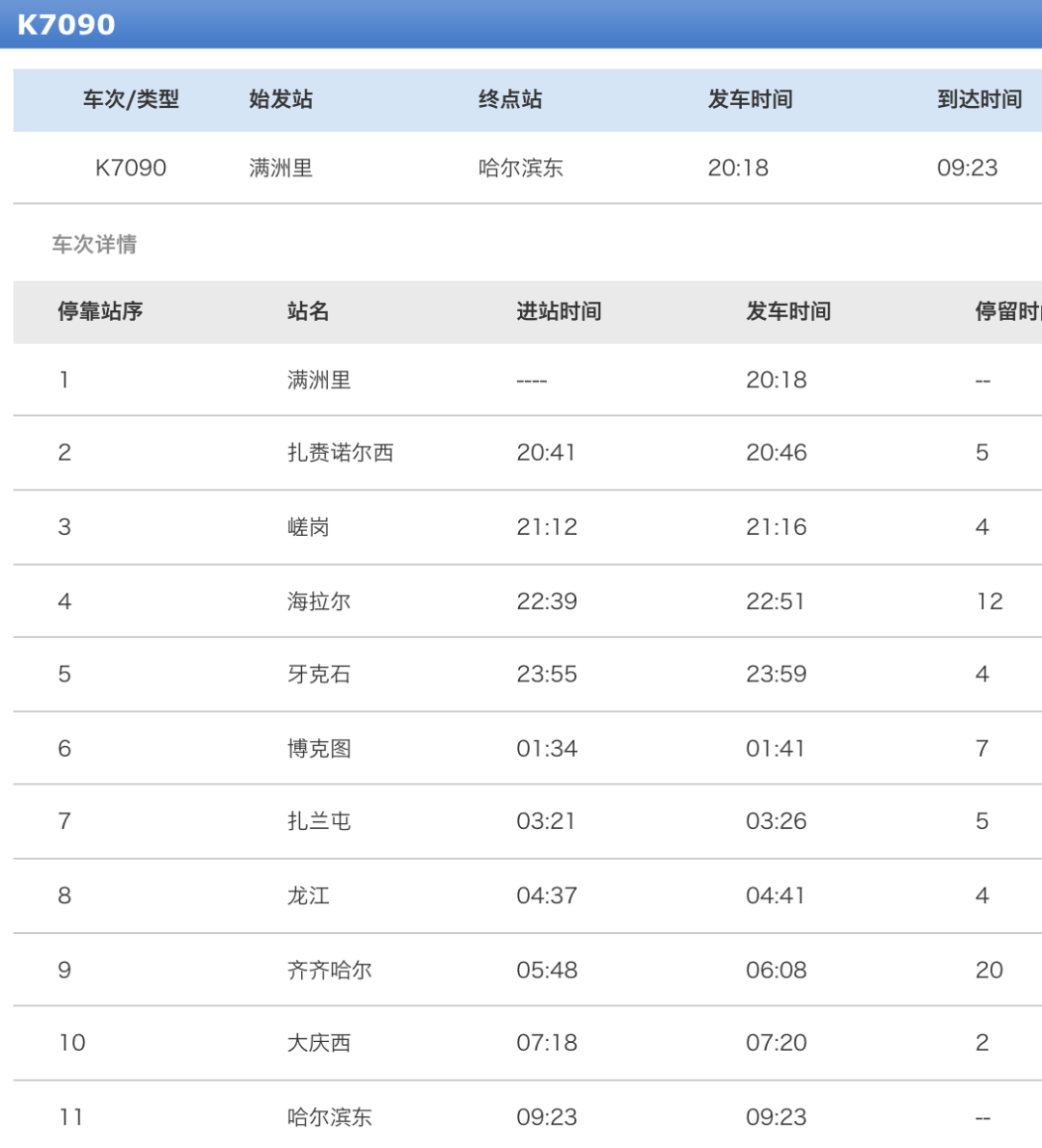 11月23日20:18满洲里站乘坐K7090次列车(加1车厢9号);