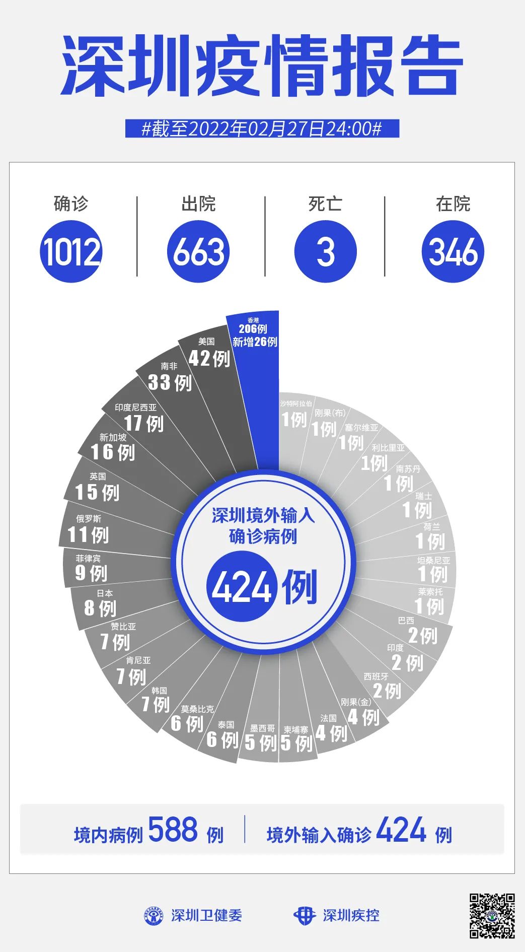 2月27日0-24时,深圳新增36例病例,其中,30例诊断为新冠肺炎确诊病例,6例诊断为新冠病毒无症状感染者;27例在集中隔离观察的密接人员中发现,8例在重点区域核酸筛查中发现,1例在重点人群核酸筛查中发现。