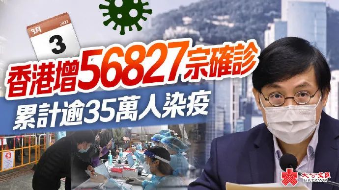 香港第五波疫情形势严峻,特区政府卫生署卫生防护中心3月3日下午公布:截至当天零时,香港新增56827例新冠肺炎确诊病例,再创单日新增数字新高,其中56825例为本地病例;目前为止,本轮疫情累计337926人感染。过去一天再有144名患者离世,包括85男59女,年龄介乎42至102岁。