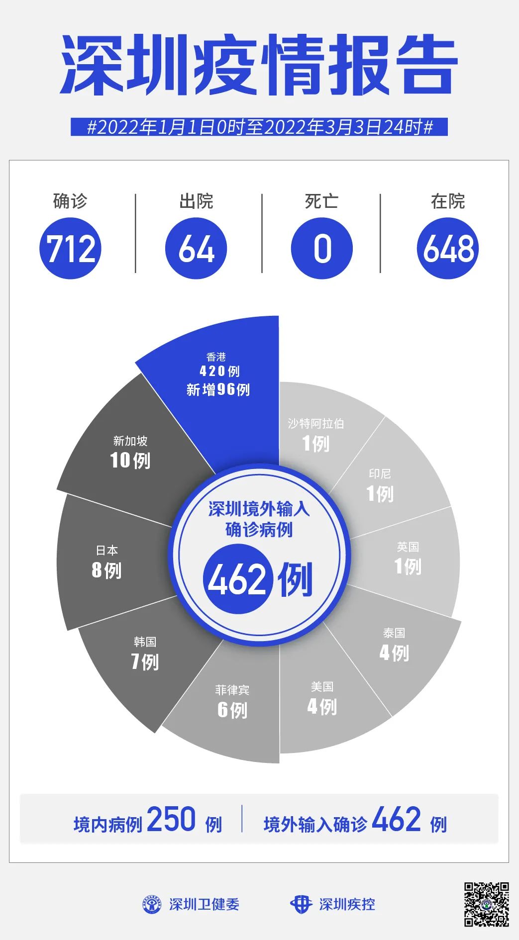 3月3日0-24时,深圳新增 22 例本土确诊病例和 1 例新冠病毒无症状感染者,新增 96 例境外输入确诊病例和 11 例境外输入无症状感染者。 96 例境外输入确诊病例,均为香港输入; 11 例境