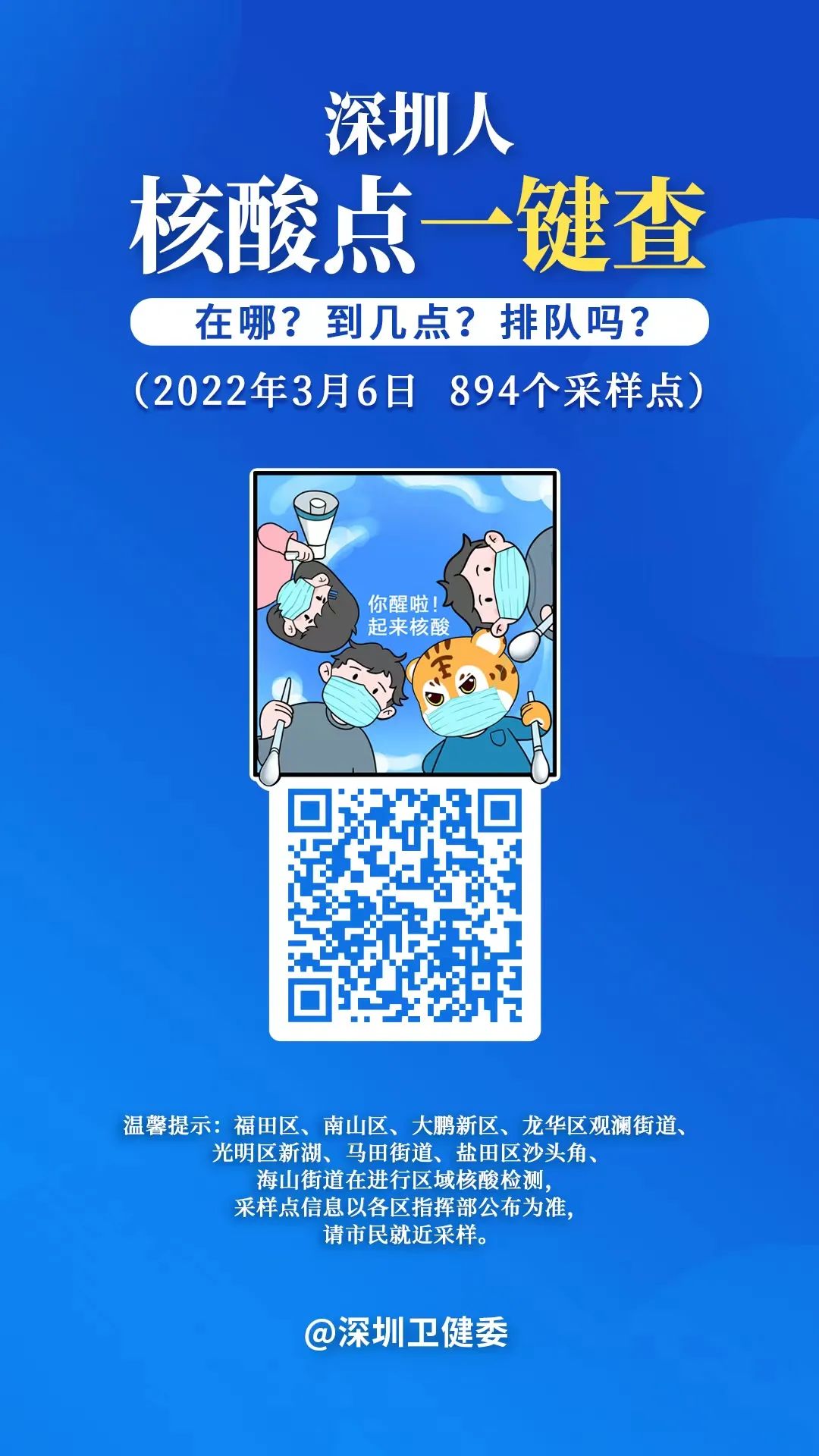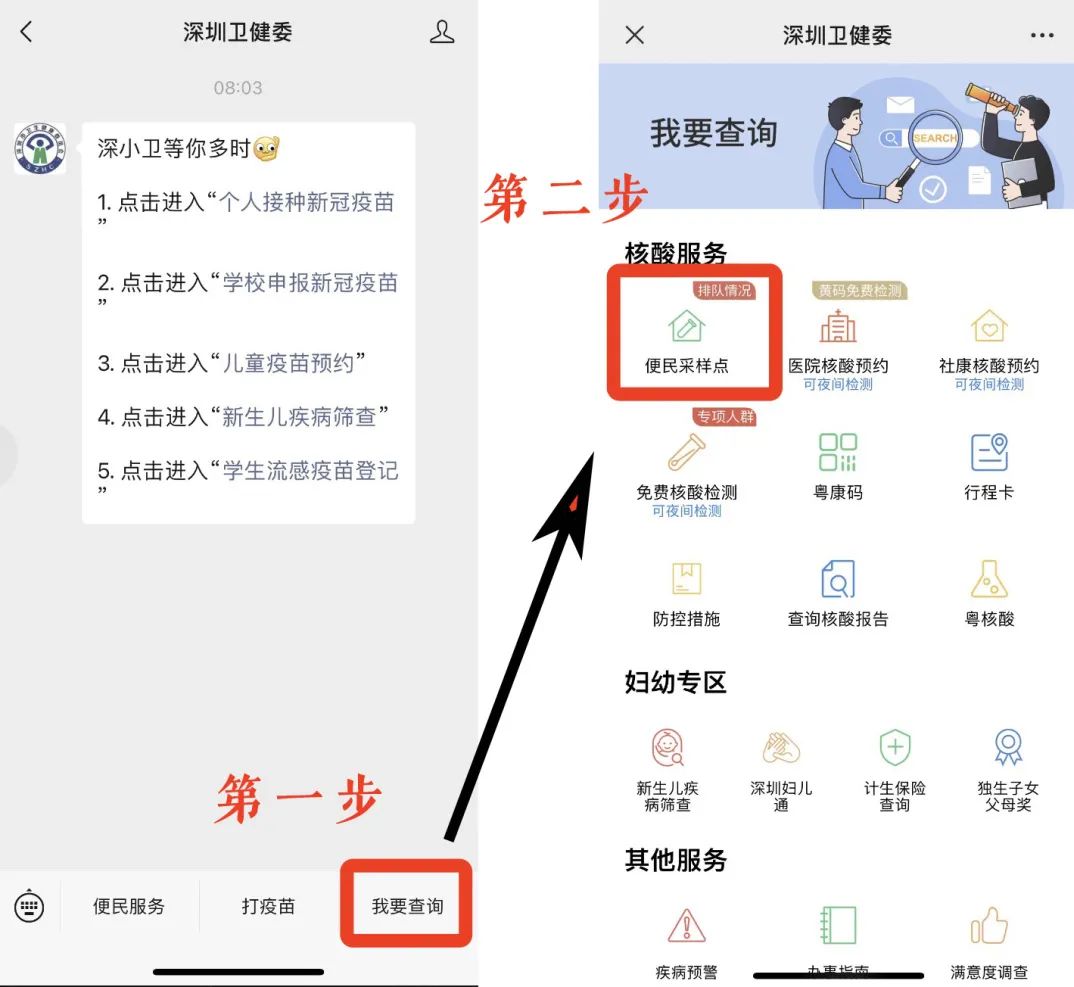 关注“深圳卫健委”公众号-【我要查询】-【便民采样点】