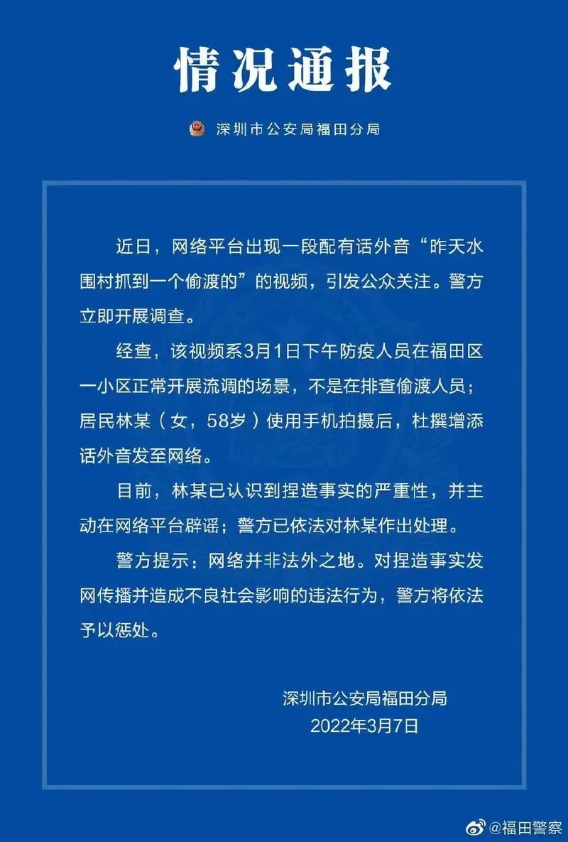 经查,该视频系3月1日下午防疫人员在福田区一小区正常开展流调的场景,不是在排查偷渡人员;居民林某(女,58岁)使用手机拍摄后,杜撰增添话外音发至网络。