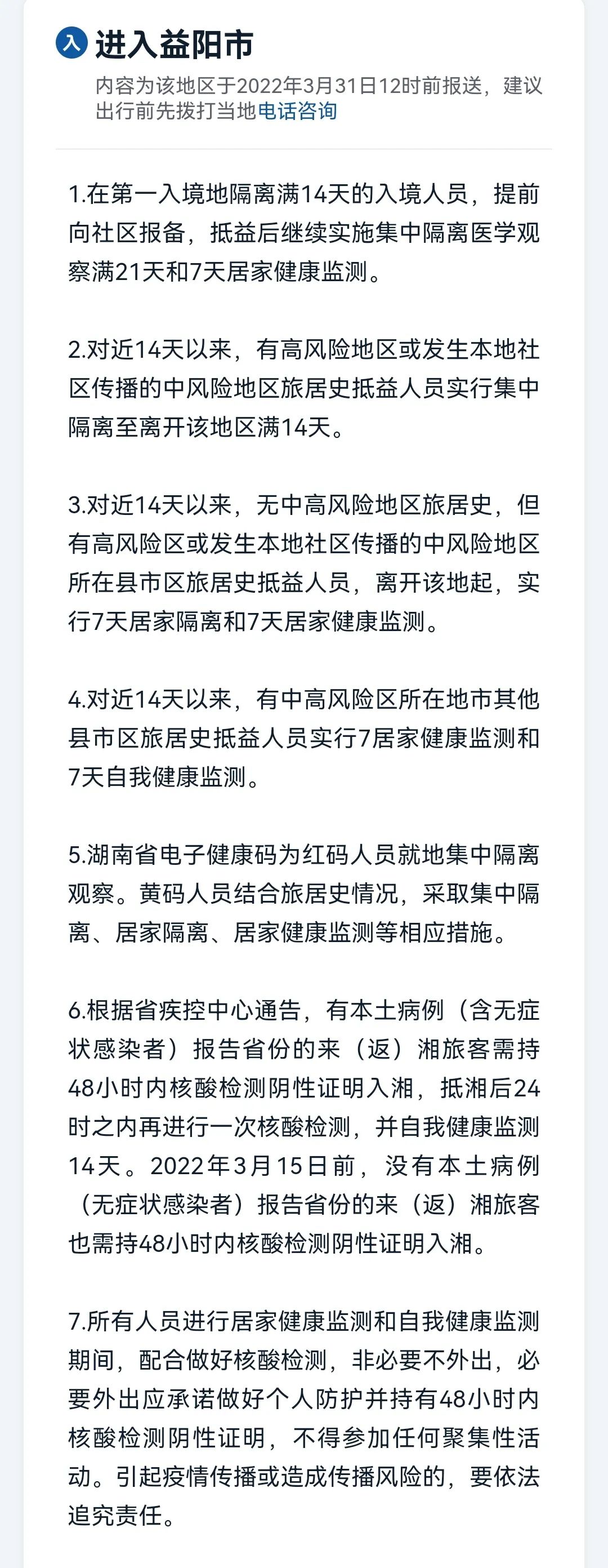 【益阳发现一例】4月1日,益阳市赫山区在集中隔离管控的上海返益人员中发现1例新冠肺炎确诊病例(轻型)。李某某,女,62岁,系上海市松江区返益人员,2022年3月30日晚持上海核酸阴性证明从上海经长沙返益,在高速公路朝阳收费站出口处,工作人员将其闭环转运进行集中隔离医学观察,3月31日晚核酸检测初筛结果异常,后经市疾控中心复核确认阳性。