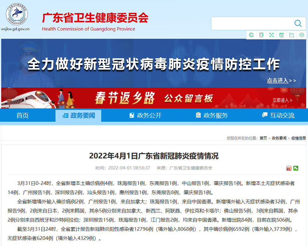 3月31日0-24时,全省新增本土确诊病例4例,珠海报告1例,东莞报告1例,中山报告1例,肇庆报告1例。新增本土无症状感染者14例,广州报告1例,深圳报告2例,汕头报告1例,惠州报告1例,东莞报告8例,肇庆报告1例。