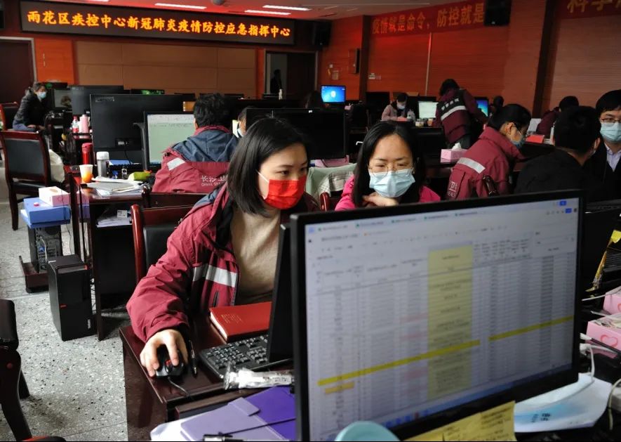 ▲流调人员在雨花区新冠肺炎防控指挥部核查信息