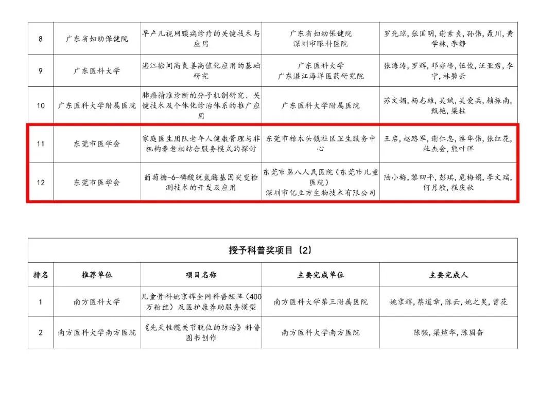 在今年1月举行的第三届广东医学科技奖颁奖大会上,东莞市医学会申报的《家庭医生团队老年人健康管理与非机构养老相结合服务模式的探讨》和《葡萄糖-6-磷酸脱氢酶基因突变检测技术的开发及应用》荣获广东医学科技奖三等奖。