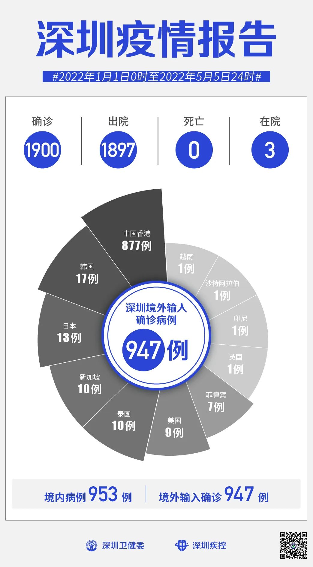 5月5日0-24时, 深圳无本土新增病例。 新增 13 例境外输入新冠病毒无症状感染者 (1例为韩国输入,12例为中国香港输入) 。 以上病例抵深后被纳入闭环管理或管控范围,后转送至深圳