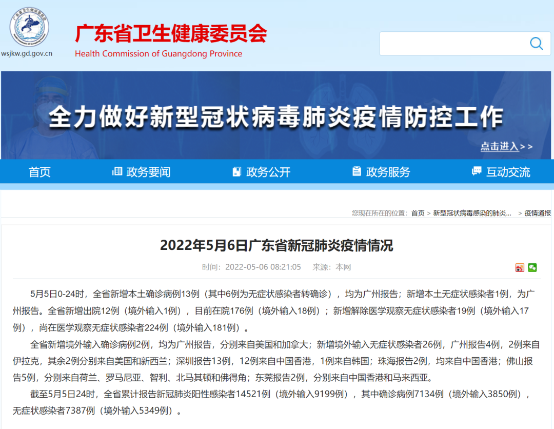 2022年5月5日广州市新冠肺炎疫情情况 2022年5月5日0时至24时,全市新增本土确诊病例13例(其中6例为此前已公布的无症状感染者转确诊)和本土无症状感染者1例。新增境外输入确诊病例