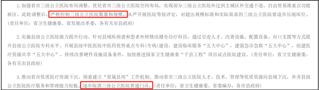 《实施方案》明确指出,要加强省市三级公立医院布局调整,严格控制三级公立医院数量和规模,从严开展医院等级评定,对超出规模标准和实际需求的三级公立医院要逐步压缩床位。推动省市三级公立医院人才、技术、管理等优质资源向县域下沉,逐步取消三级公立医院普通门诊。