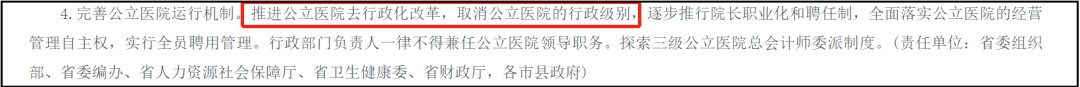 《实施方案》明确指出,要完善公立医院运行机制,推进公立医院去行政化改革,取消公立医院的行政级别,逐步推行院长职业化和聘任制,全面落实公立医院的经营管理自主权,实行全员聘用管理。