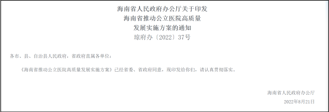 8月30日,海南省人民政府办公厅发布了《海南省推动公立医院高质量发展实施方案》(下称《实施方案》)的通知。