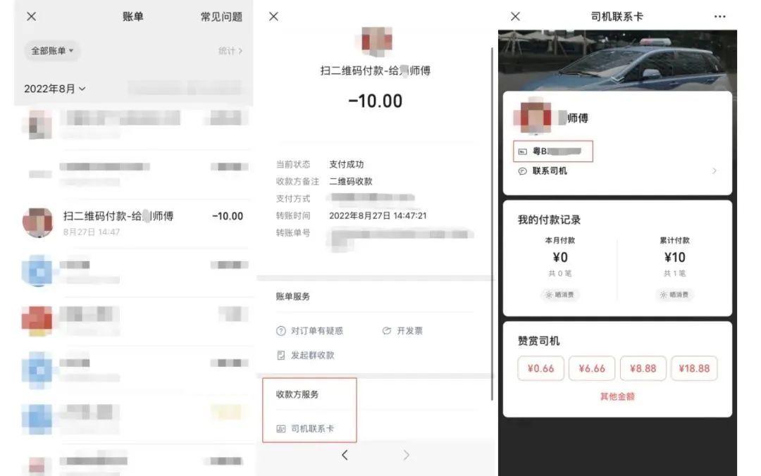 点击支付出租车订单记录-最下方收款方服务:司机联系卡-车牌号(粤BXXXXXX)