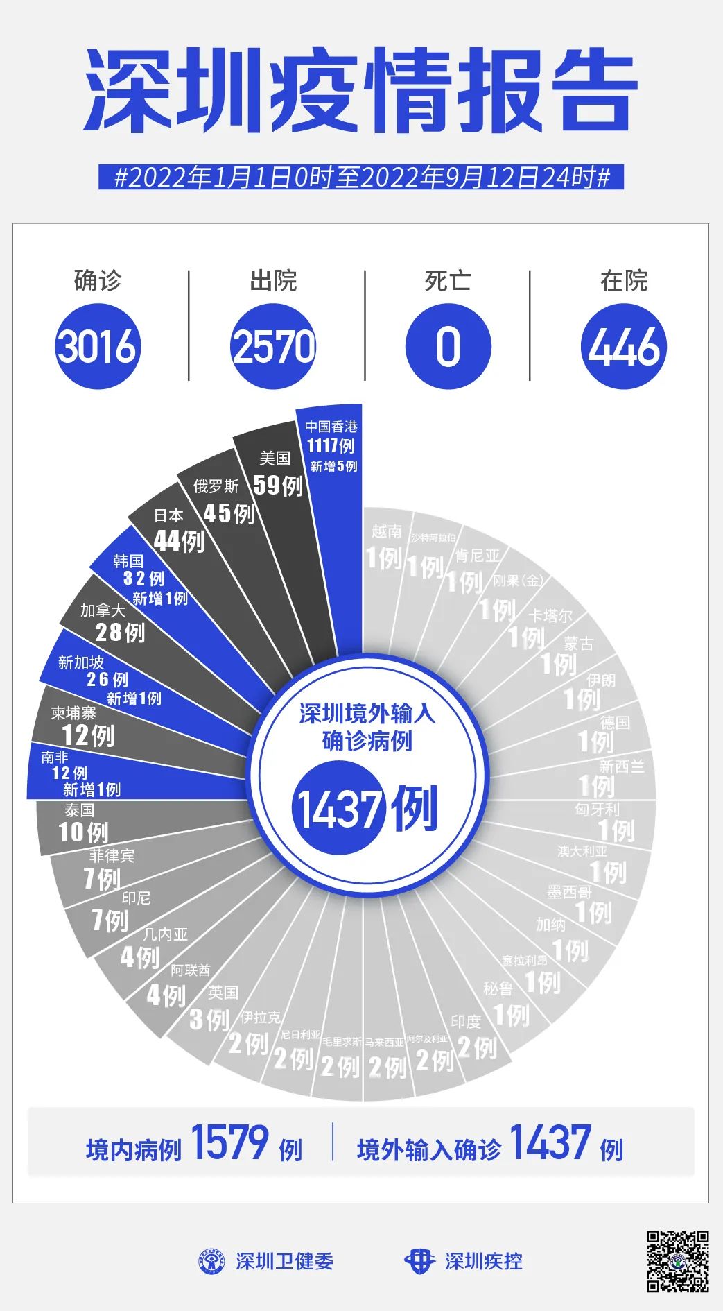 9月12日0-24时,深圳本土新增 4例 新冠肺炎确诊病例和 4例 新冠病毒无症状感染者。 新增境外输入新冠肺炎确诊病例 6例 和新冠病毒无症状感染者 9例 ;另有2例境外输入无症状感染者转