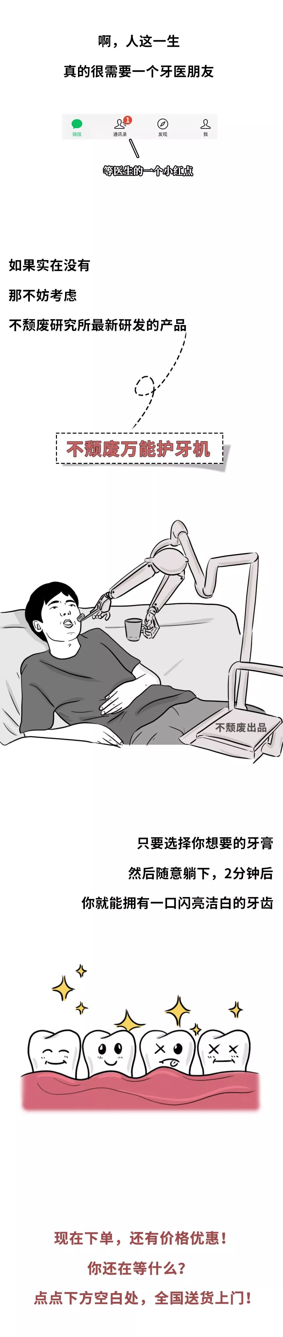 发哥知道你们奶茶是不可能不喝的、火锅也是不可能不吃的,所以发哥郑重建议你们养成良好的卫生习惯,不管你用的是电动牙刷还是普通牙刷,每天早晚都要用巴氏刷牙法(划重点:让牙刷和牙龈呈45度角,每次刷2-3颗牙)认真刷牙2-4分钟;刷完牙以后也刷一下舌头,但不要太大力,毕竟舌头也是亲生的;吃完饭后用可以牙线清洁牙缝,用漱口水清洁口腔。