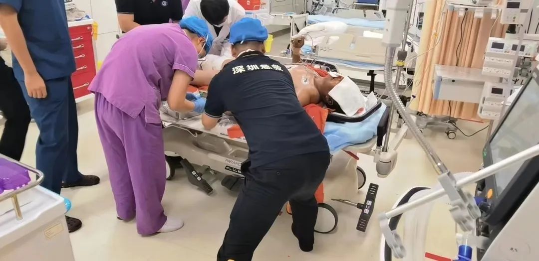 中午11点40分,救护车带着老白到达了深圳大学附属华南医院急诊中心,医院立刻开启交通创伤救治中心绿色通道,重症医学科、神经外科、心胸外科、骨科、普外科、麻醉科、耳鼻喉科、呼吸内科等各学科专家们早已在急诊抢救室待命,一场多学科协作的大抢救开始了!