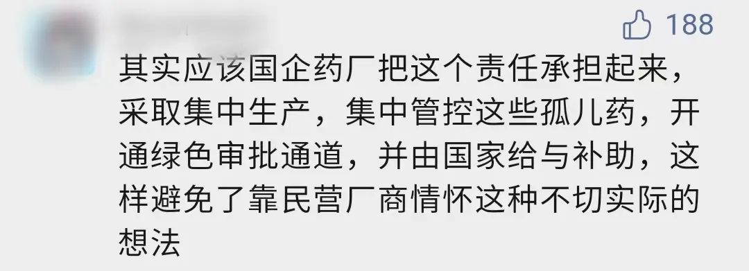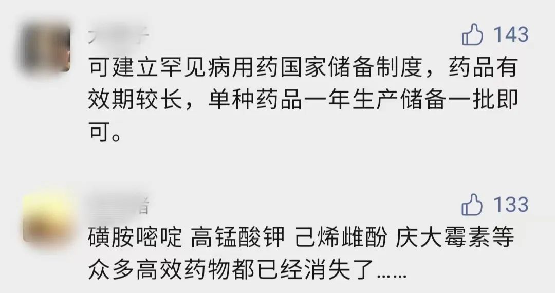 有网友不禁询问,这些药物利润不好,但可都是救命的药,药厂不生产了,相关政府部门能不能制定一些政策,给国企药厂一些财政兜底,督促他们肩负起民生职责,采取集中生产、集中管控的方法,重新把那些药物生产起来。