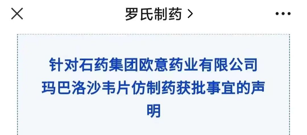罗氏制药在其官方微信公众号发布了《针对石药集团欧意药业有限公司玛巴洛沙韦片仿制药获批事宜的声明》,声明直言石药欧意公司的行为已对罗氏制药就玛巴洛沙韦片的后续研发和商业化工作带来了极大干扰。